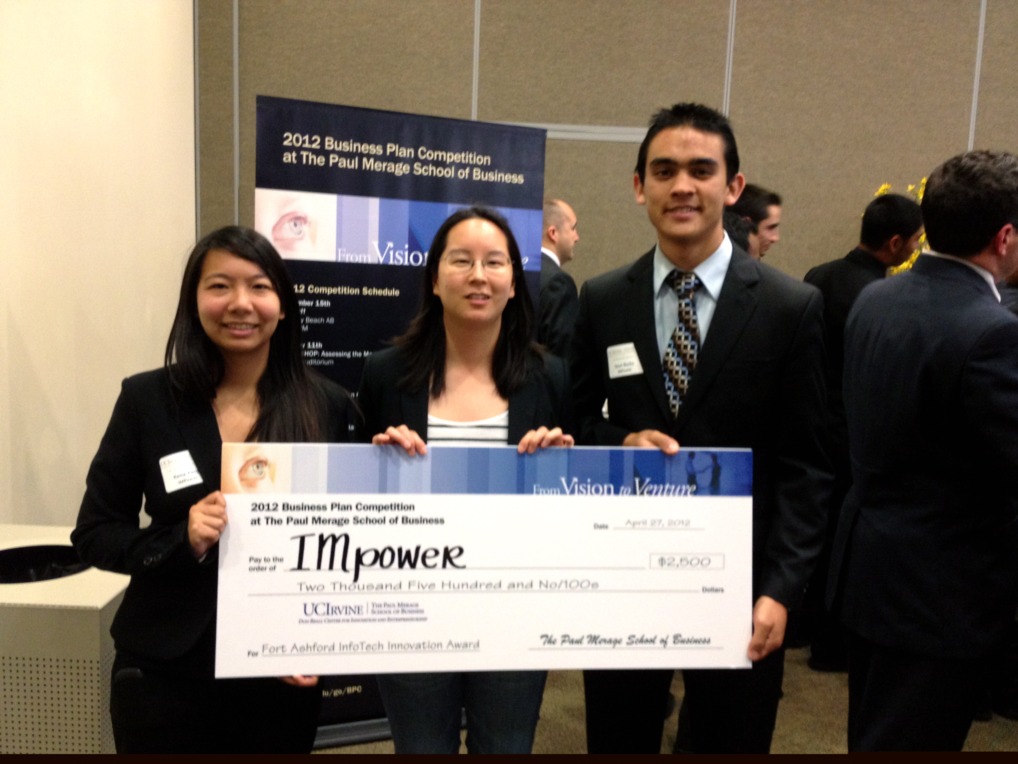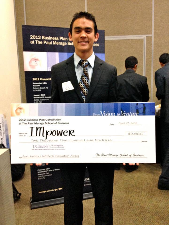 Our team IMpower won the 2012 Fort Ashfort Innvotion award at the 2012 Paul Merage Business Plan Competition at UC Irvine! We developed a power strip that would help reduce the power waste in electronic devices. It could detect when you were home, and when you were out using your WiFi network, and turn off the power strip accordingly.