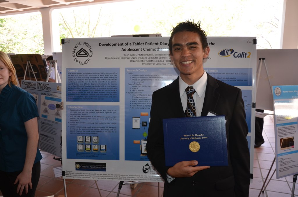 Wow! I won the highest award given to an undergraduate research at UC Irvine, the Chancellor’s Award for Excellence in Undergraduate Research! I received this for the work I did with Professor Bachman on Pain Buddy, a cross browser mobile application that would help children with cancer communicate with their doctors better. The application was developed for both Android and iPad, and featured a child friendly application that would transmit the data to an online server. We had focus groups and meetings to continually improve the application, and it took many, many hours to complete.
