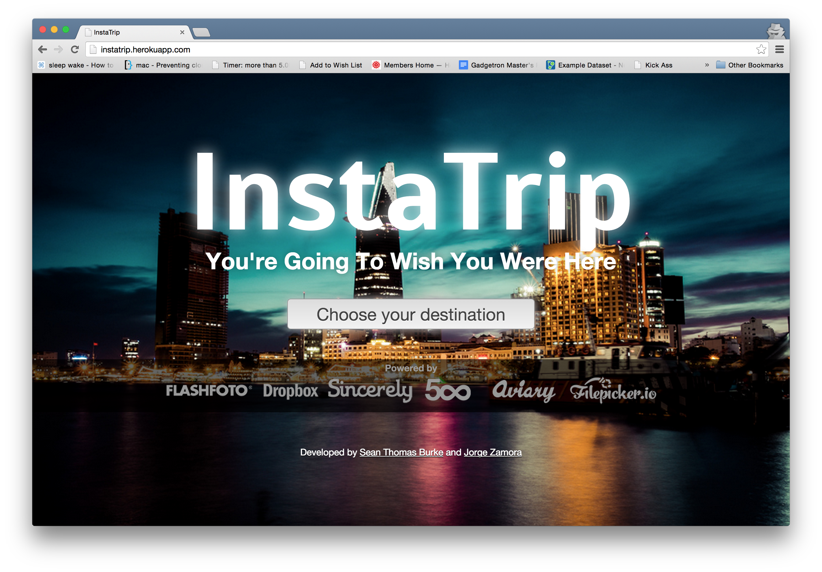 So anyway, we coded all throughout the night, and we created Instatrip which utilized FlashFoto, Sincerely, Filepicker.io, 500px, Aviary, and Dropbox.